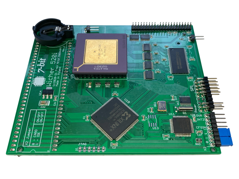 Wicher 520i turbo card is designed for installation inside the Amiga 500/500+ case. It supports full version of the 68020 processor, 32 MB of FAST RAM, and 2.5" IDE hard drives. It has the ability to set the processor clock speed up to 33 MHz.